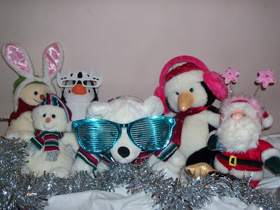 We have a large selection of seasonal cuddlies and last night I got them out along with the props left over from my daughter's party photo booth. I know what you are thinking, she is losing her marbles. LOL